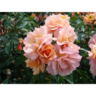 Роза Априкола — это мощный куст, раскидистый и ветвистый, достигающий высоты 70-80 см и ширины до 60 см. Его прямые побеги украшают темно-зеленые листья среднего размера с сильным глянцевым блеском. В соцветиях распускается по 4-5 бутонов, издавая слабый, но приятный фруктовый аромат с легкой сладостью.